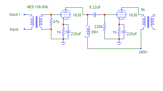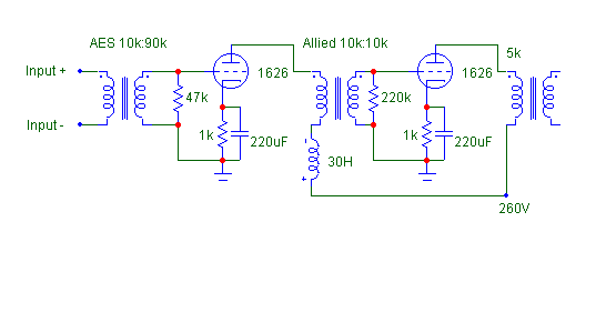 I spent some time testing the Allied 10k:10k interstage as well. Unfortunately, it's not as great as the AES interstage. In fact, it SUCKS. With or without DC current flowing through it, it SUCKS. There seems to be 2 peaks in the frequency response. A mild 6dB peak at ~30kHz and a horrendous 12dB peak at ~55kHz. Worse thing is, there's nothing much I could do about it. Low frequency response isn't great either. The spec says down to 150Hz and you don't have to doubt this. By the way, the interstage looks like it's made by Hammond. The box, the build and the labelling looks too similar to Hammond. To improve the bass, the above schematics has a 30H choke in series with the primary.