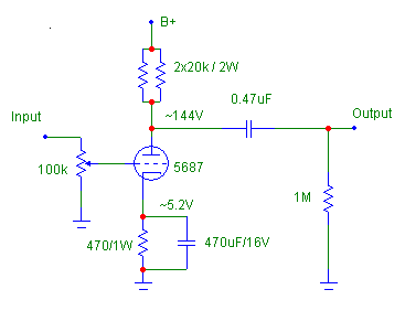 Now that we have settled on the B+, we need a plate load. A resistor of some magnitude. Typically for triodes, we want to load it many times its plate resistance. 5687 has a plate resistance of ~2kohm so if we load it 5x, this means a plate resistor of 10kohm. Alright!